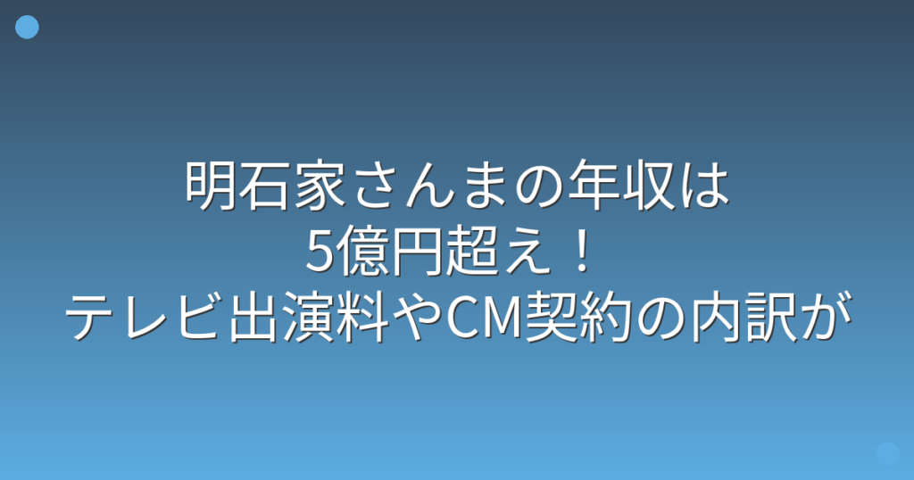 お笑い界のレジェンドとして長年活躍し続ける明石家さんまさんの年収が話題になっていますね。 テレビで見ない日はないほどの活躍ぶりですが、一体どれくらいの収入を得ているのか気になる方も多いのではないでしょうか。 そこで今回は、明石家さんまさん... -