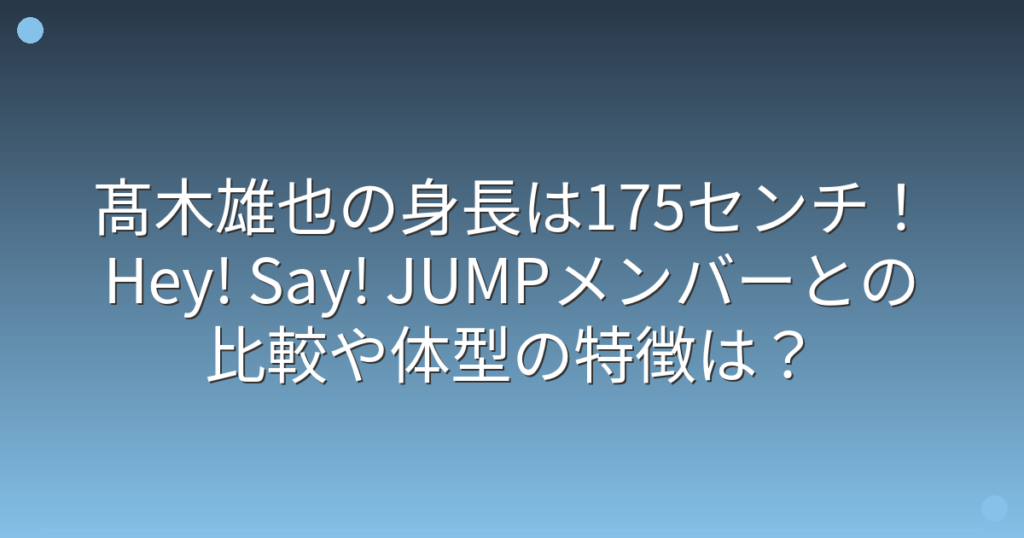 Hey! Say! JUMPのメンバーとして活躍する髙木雄也さんの身長が気になっている方も多いのではないでしょうか。 アイドルグループのメンバーは、テレビやステージでの立ち位置や衣装によって身長の印象が変わることもあり、実際の身長が話題になることがよく... -
