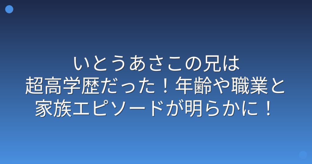 お笑い芸人として長年活躍されているいとうあさこさんですが、最近そのお兄さんについて話題になっていますね。 いとうあさこさんは番組内で時折家族の話をされることがあり、特にお兄さんとのエピソードが注目を集めています。 そこで今回は、いとうあさ... -