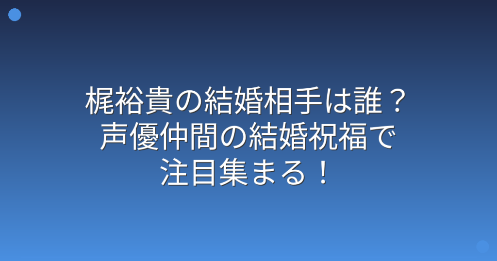 人気声優の梶裕貴さんの結婚について、多くのファンが気になっているようです。 特に最近、声優仲間の結婚を祝福するコメントを投稿したことで、改めて注目が集まっています。 そこで今回は、梶裕貴さんの結婚に関する最新情報について、詳しく見ていきま... -