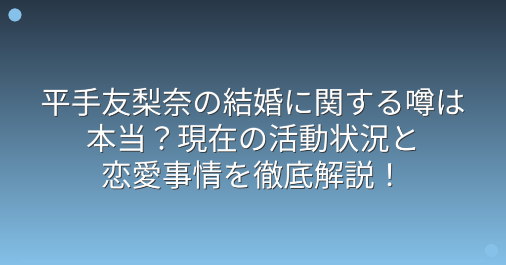 最近、元欅坂46のセンターとして知られる平手友梨奈さんの結婚に関する噂が話題になっています。 2025年9月現在、24歳となった平手さんは、女優やソロアーティストとして精力的に活動を続けており、その活躍ぶりに注目が集まっています。 そこで今回は、平... -