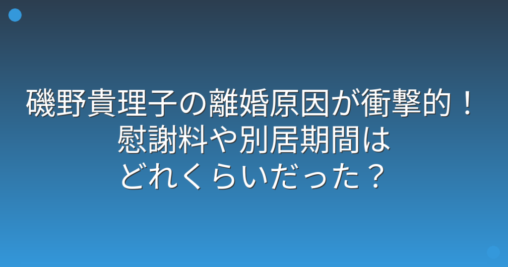 タレントの磯野貴理子さんの離婚について、ファンの間で話題になっていますね。 明るいキャラクターで人気の磯野貴理子さんですが、過去の離婚についてはあまり詳しく知らない方も多いのではないでしょうか。 そこで今回は、磯野貴理子さんの離婚原因や慰... -