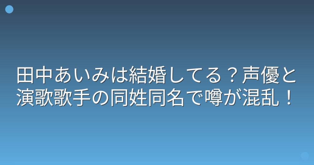 声優や演歌歌手として活躍する田中あいみさんの結婚について、ネット上で様々な噂が飛び交っていますね。 実は「田中あいみ」という名前の方は複数いて、声優さんと演歌歌手さんが同姓同名なんです。 そのため、結婚に関する情報が混同されて検索されるこ... -