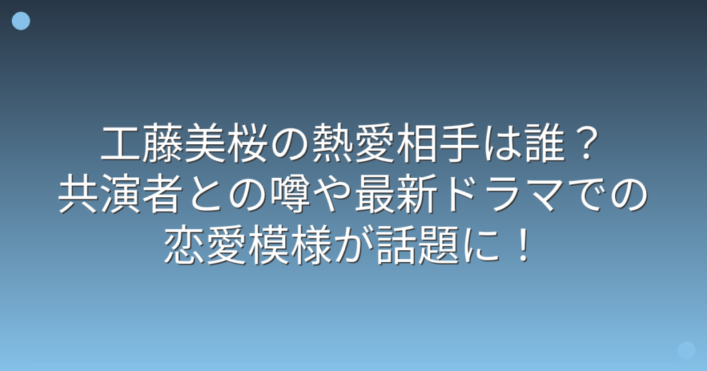 若手女優として注目を集める工藤美桜さんの熱愛情報が、ネット上で話題になっていますね。 特に2025年11月からスタートする新ドラマでの恋愛シーンが注目を集めており、実際の恋愛事情についても関心が高まっています。 そこで今回は、工藤美桜さんの熱愛...