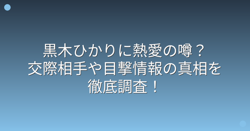 黒木ひかりさんに熱愛の噂が浮上し、ファンの間で話題になっていますね。 人気急上昇中の黒木ひかりさんだけに、プライベートな恋愛事情が気になるという声も多く聞かれます。 そこで今回は、黒木ひかりさんの熱愛の噂や交際相手、目撃情報の真相について...